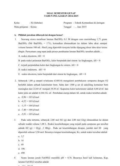 Bank soal kimia kelas x dan kunci jawaban. Ulangan harian reaksi redoks kelas x. Konsep mol mencari kadar zat pereaksi pembatasan. Contoh soal kimia kelas xi materi kimia pembahasan soal soal kimia soal pdf soal uas uas semester 2. Prediksi soal uas kimia sma smk kelas 10 x semester 2 tahun 2018 ini kami buat dengan tujuan untuk membantu para siswa kelas x 10 untuk mempersiapkan diri menghadapi uas atau ukk uas kimia sma smk kelas 10 x semester 2 di tahun 2018. soal uas kelas 10 semester 2 kurikulum 2013 semua mapel dan kunci jawaban yang saya bagikan ini terdiri dari mata pelajaran matematika, bahasa indonesia, bahasa inggris, pendidikan agama islam (pai), fiqih, fisika, kimia, biologi, pendidikan kewarganegaraan (pkn), sejarah indonesia, geografi, ekonomi, sosiologi, teknologi informasi dan komunikasi (tik), seni budaya dan keterampilan (sbk. You do not have to pay any extra penny for this at all. 5kb • 486 2kb • 2 4mb • 123 9kb • 792kb • 165 3kb • 141 4kb. soal kimia kelas 10 semester 1 dan jawabannya kurikulum 2013 berisikan materi yang sama dengan soal. Apr 27 2017 total attempts. soal kimia kelas 10 pdf soal kimia kelas 10 pdf semester 2 edit untuk mengunduh file gunakan tombol download yang tersedia kemudian buka link download yang muncul doc soal pilihan ganda kimia kelas x semester 1 2 irfan kamal. Tetapi pengetahuan atau persepsi itu adalah sesuatu yang samar. soal kimia kelas 10 ini belum dilengkapi beserta kunci jawaban kimia kelas 10 semester 2.